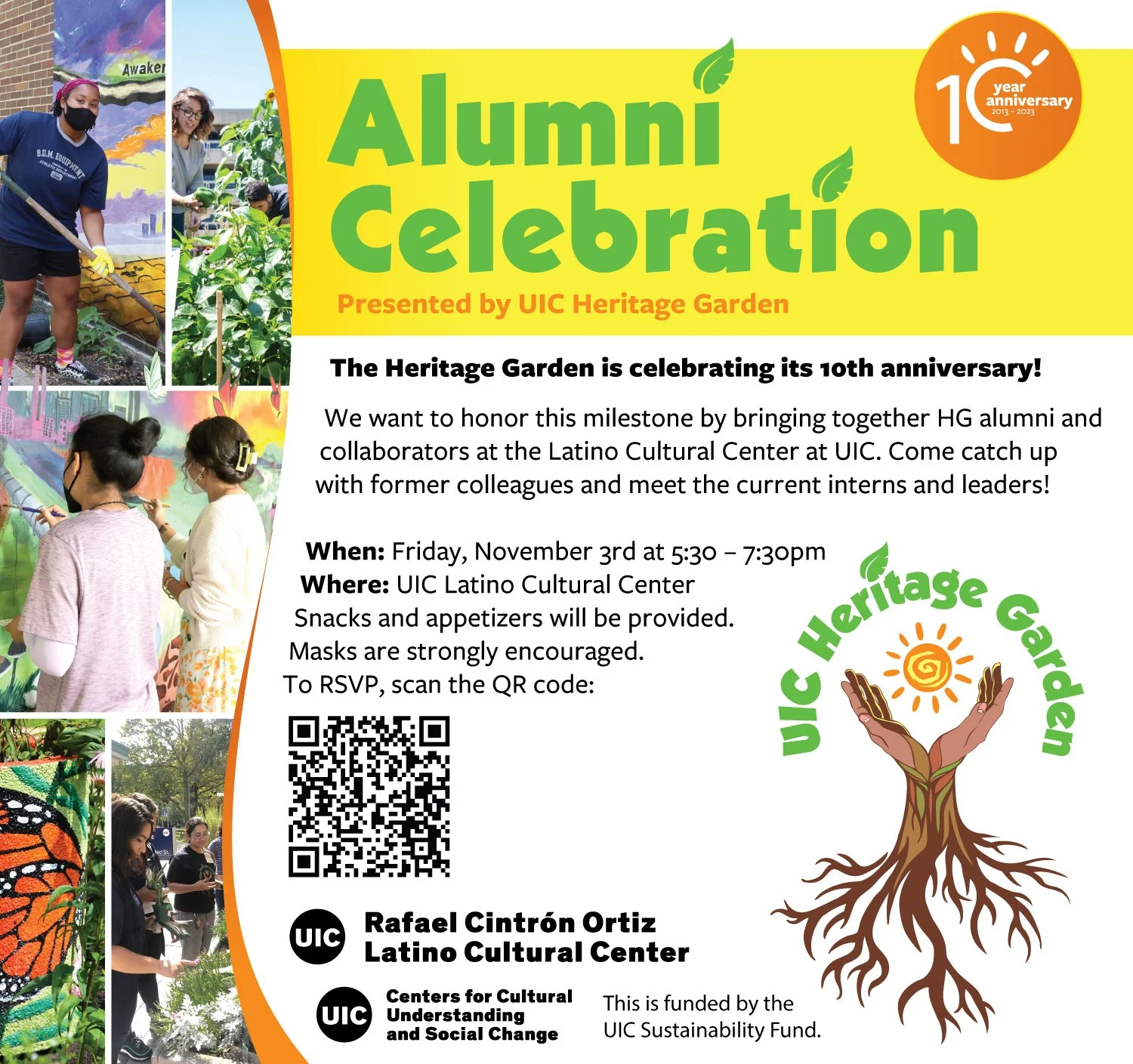 Yellow header with the title of the event in green letters are across the top and an orange sun with “ 10 year anniversary 2013-2023” at the top right corner. Text of the poster is in a white background. Five images of students gardening, painting, and giving tours are along the left side of the poster. In the bottom left is a QR code to RSVP to the event. The logos of the Centers for Cultural Understanding and Social Change, the UIC Latino Cultural Center and the UIC Heritage Garden are at the bottom along with text stating “ This is funded by the UIC Sustainability Fund.”