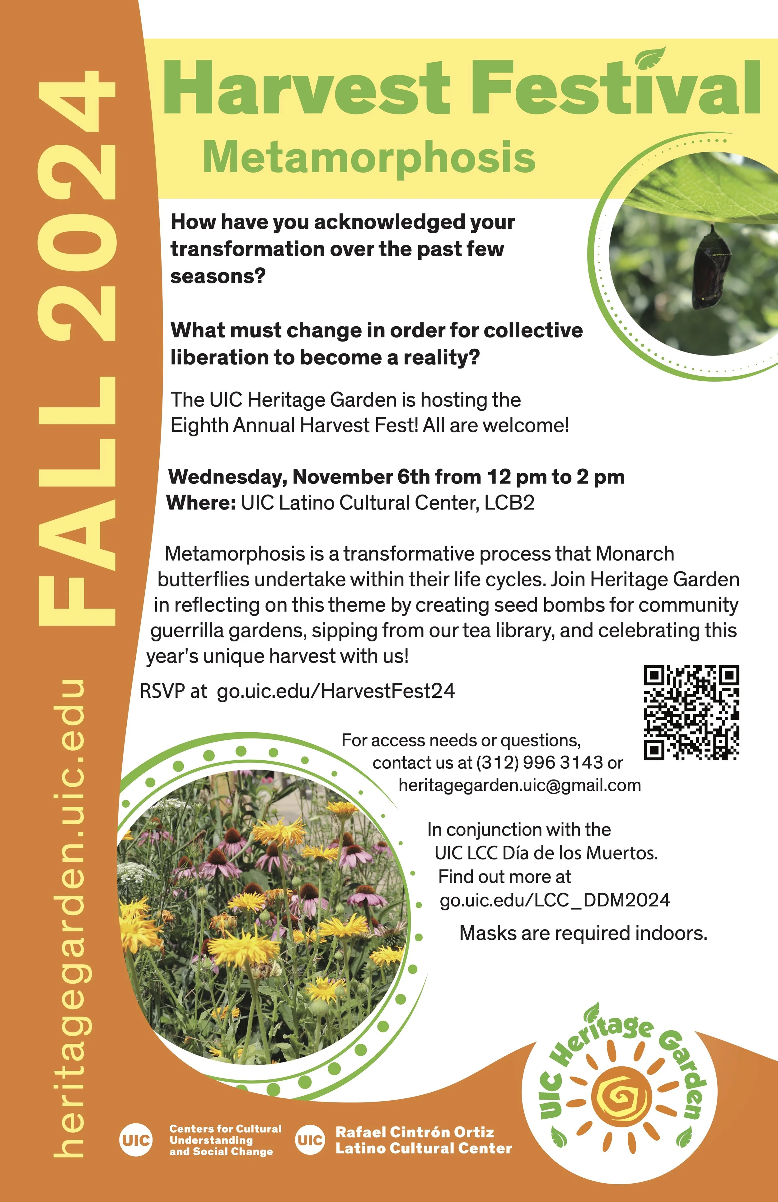Vertical undulating orange line with yellow letters that read heritagegarden.uic.edu Fall 2023. A yellow horizontal stripe towards the top reads in green letters Harvest Festival 10 year anniversary - Rest, Reclamation, Rebirth. The text with the event details is listed in a white background. There are two pictures in the poster in a circular shape surrounded by a circular green border made up of an outside green line and an inside set of green dots. One image in the top right corner is a jar full of dried mint and a jar full of dried marigolds. The second image in the lower left hand corner features six students posing in front of a corn husk and marigold arch with props such as a monarch butterfly cutout, mask, mustache and a day of the dead sign. The logos for the Centers for Cultural Understanding and Social Change, the UIC Latino Cultural Center, and the UIC Heritage Garden are at the bottom.