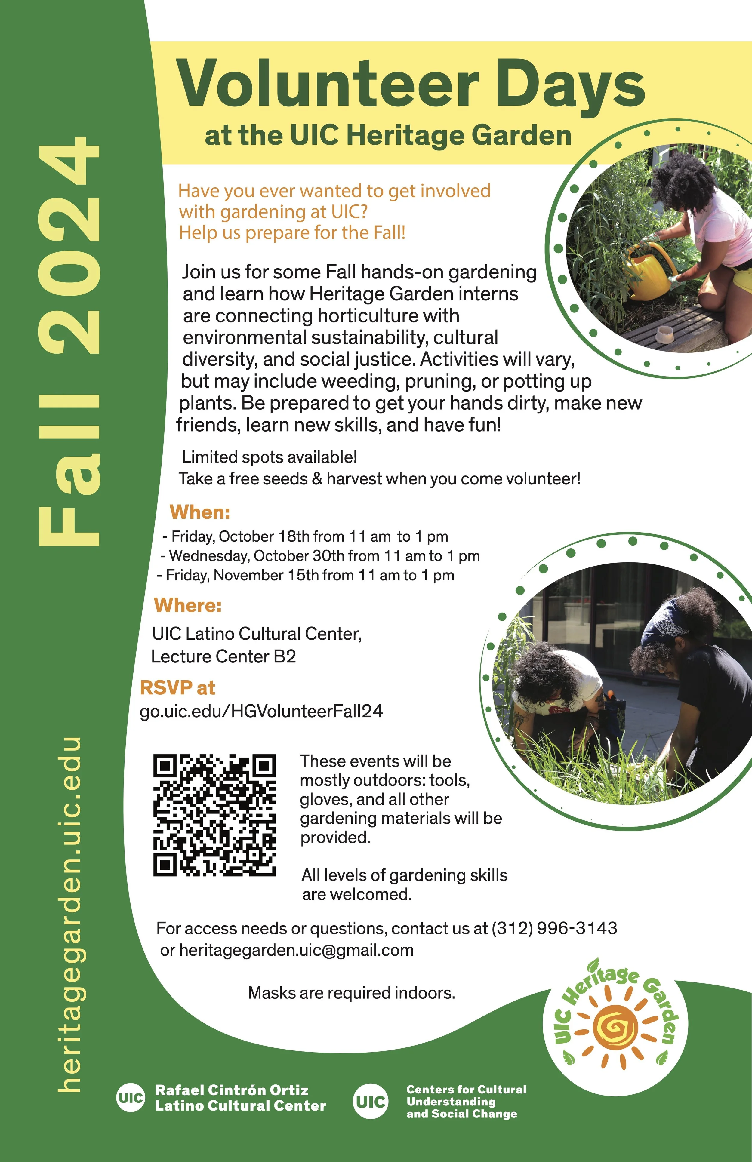 For access needs or questions, email heritagegarden.uic@gmail.com or call 312-996-3143. All audiences are welcome. Paid parking available. The space is wheelchair accessible.