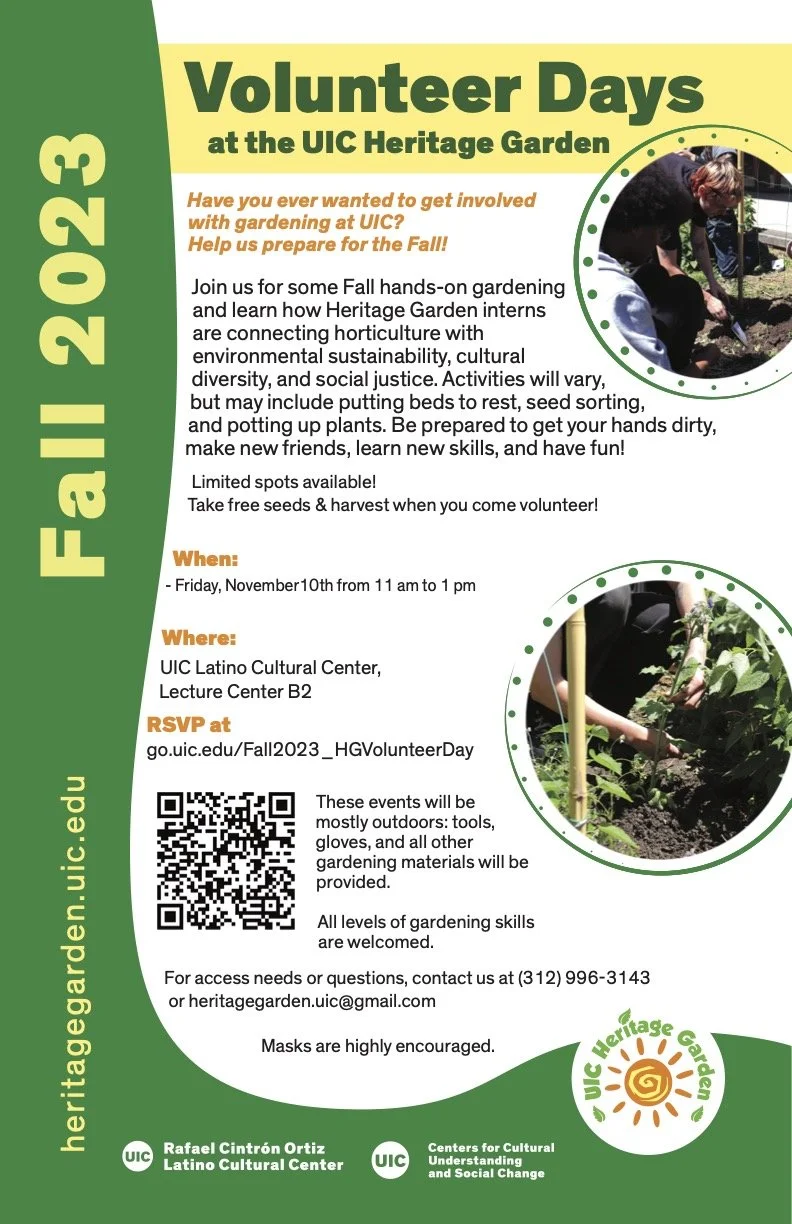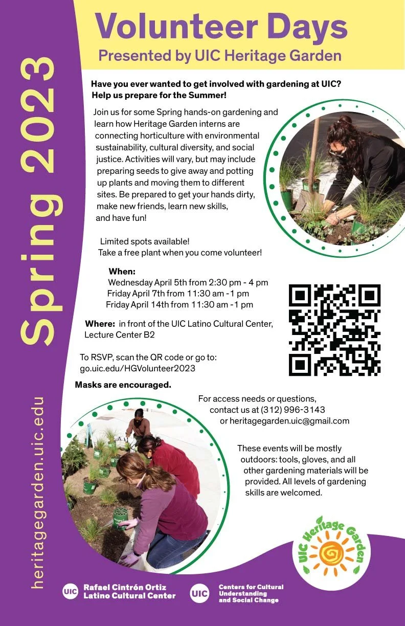 Yellow header with the title of the event in green letters. Text of the poster is in a white background. A circular image of a student wearing a face mask and with their hand hovering over seedlings in pots is on the top right corner. In the middle right is a QR code to RSVP to the event. In the lower left corner is a circular image of UIC Heritage Garden seed packets in two rows on a table. The side and bottom is a dark green frame with “heritage garden.uic.edu” and “April 2023” written vertically in yellow letters.The logos of the Centers for Cultural Understanding and Social Change, the UIC Latino Cultural Center and the UIC Heritage Garden are at the bottom.