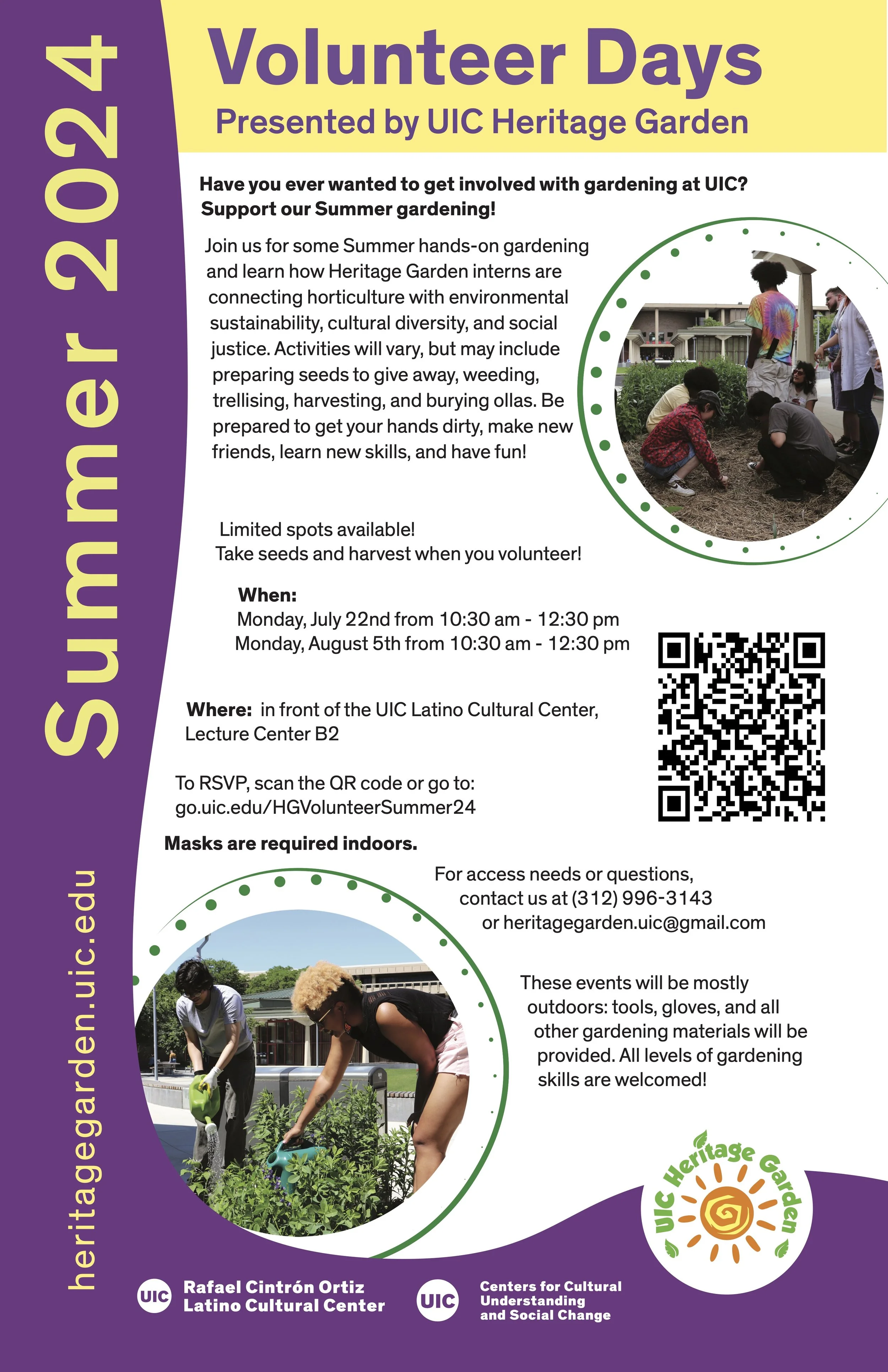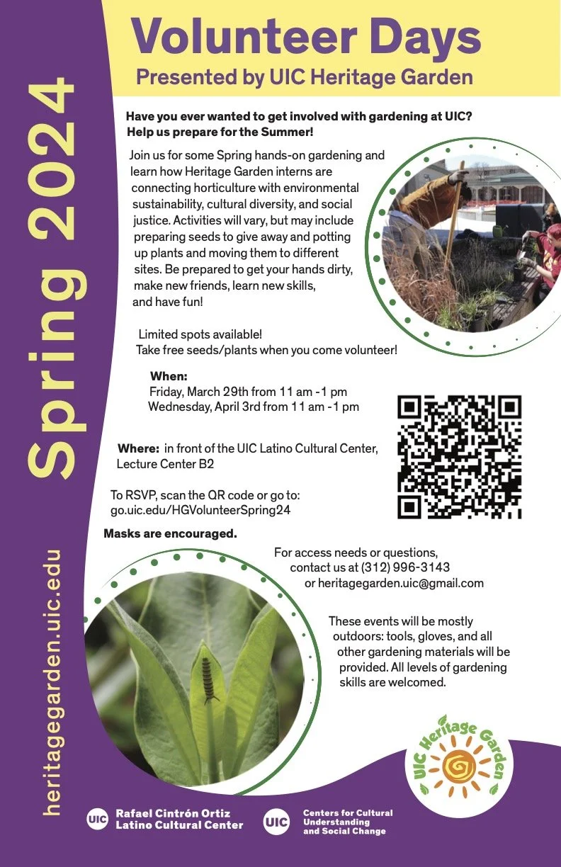 Yellow header with the title of the event in purple letters. Text of the poster is in a white background. A circular image of a students with a shovel standing in the raised bed and another kneeling at the base of the raised bed pouring soil with a trowel into a pot is on the top right corner. In the middle right is a QR code to RSVP to the event. In the lower left corner is a circular image of a monarch caterpillar in the middle of four milkweed leaves. The side and bottom is a dark purple frame with “heritage garden.uic.edu” and “Spring 2024” written vertically in yellow letters.The logos of the Centers for Cultural Understanding and Social Change, the UIC Latino Cultural Center and the UIC Heritage Garden are at the bottom.