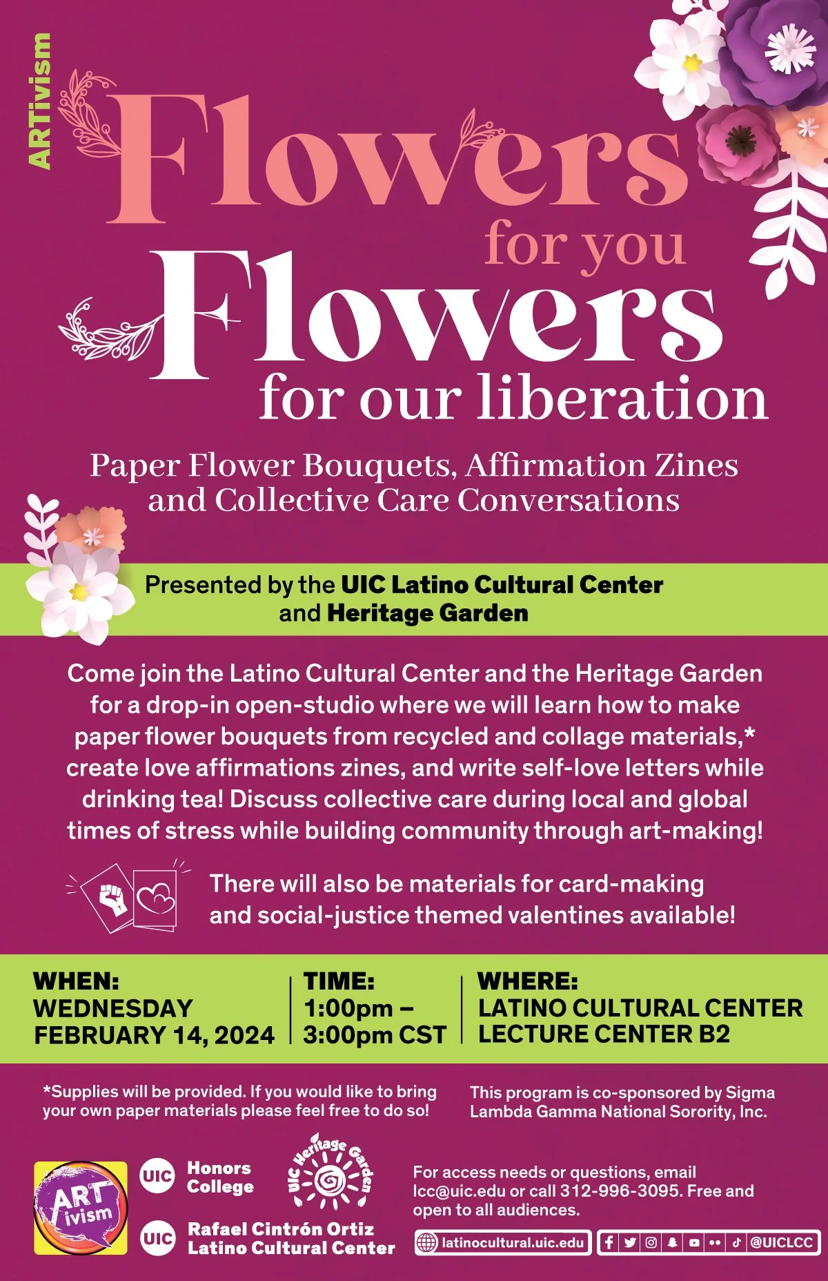 This is a maroon flyer with flowers illustrations at the top right corner and middle. Orange and yellow header text that reads "Flowers for you, Flowers for our liberation" is at the top of the page. There's a green stripe in the middle and bottom of the page with information details on the event. At the bottom left corner is the ARTivism logo, UIC Honors College, UIC Rafael Cintron Ortiz Latino Cultural Center and UIC Heritage Garden logos.