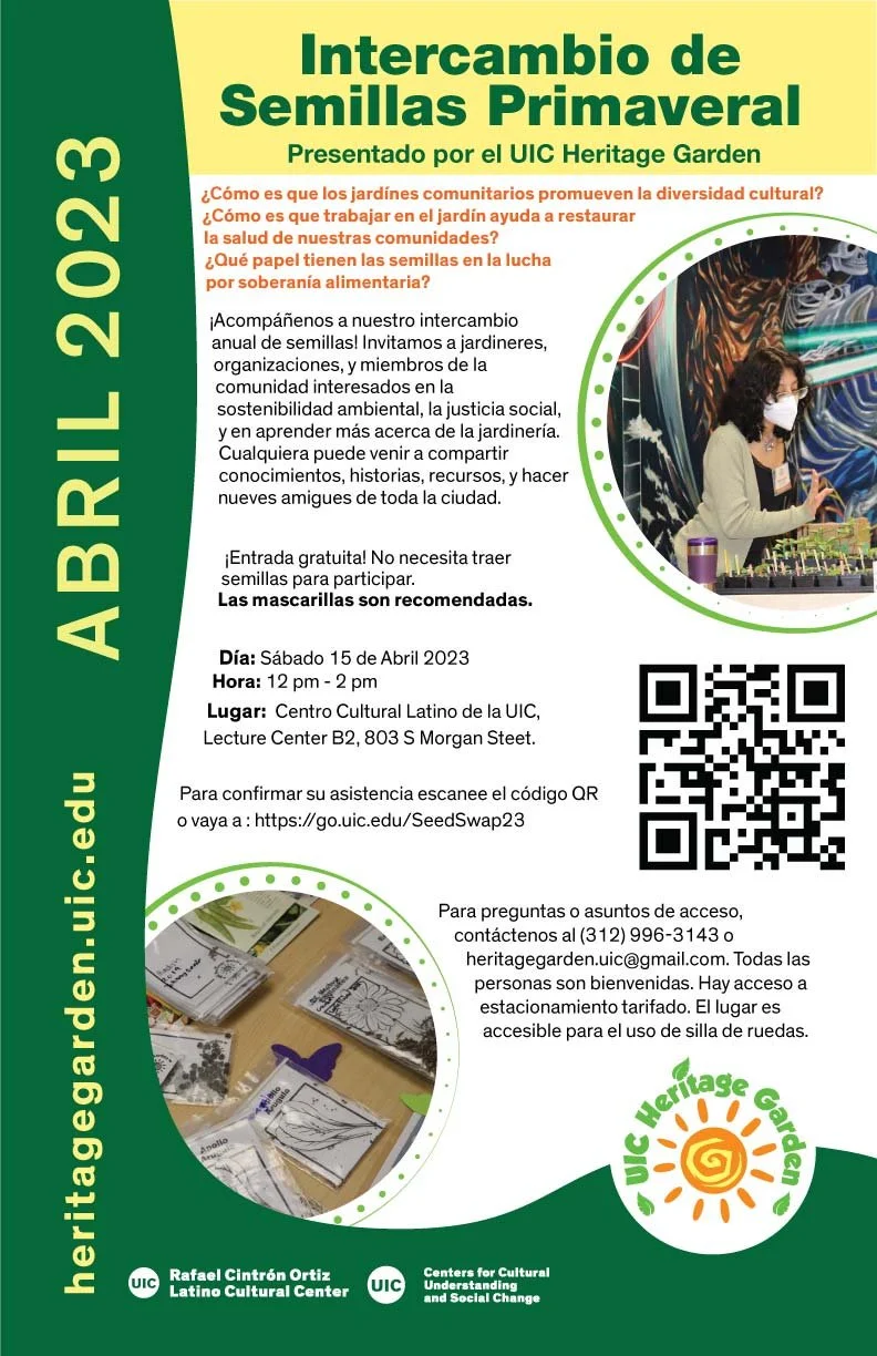 Encabezado amarillo con el título del evento en letras verdes. El texto del póster tiene un fondo blanco. En la esquina superior derecha hay una imagen circular de una estudiante con una mascarilla y con la mano sobre las plántulas en macetas. En el centro a la derecha hay un código QR para confirmar su asistencia al evento. En la esquina inferior izquierda hay una imagen circular de paquetes de semillas del UIC Heritage Garden en dos filas sobre una mesa. El lado y la parte inferior es un marco verde oscuro con "heritage garden.uic.edu" y "Abril 2023" escritos verticalmente en letras amarillas. Los logotipos de los Centros para el Entendimiento Cultural y el Cambio Social, el Centro Cultural Latino de la UIC y el UIC Heritage Garden están en la parte inferior.